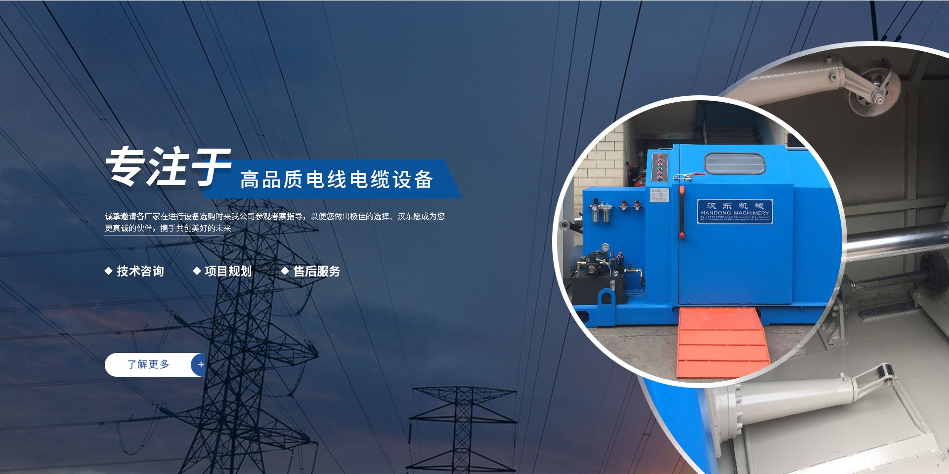 常州漢東機械始創于2006年,是集電線電纜機械設計、開發、制造、安裝、調試為一體化的高科技企業。本公司自開業以來,積極引進日本,歐美等國外電線電纜設備之先進技術,先后成功推出了達到行業先進水平的電線電纜設備,主要產品有擠出、繞包、束線、成纜等電線電纜固定設備。在提供系統設備的同時,還向客戶提供售前技術咨詢、項目規劃、以及售后服務。我公司本著“以人為本、科技先導、用戶為上”的宗旨,為客戶提供牢靠的產品與省心的服務。漢東愿成為您更真誠的伙伴,攜手共創美好的未來!